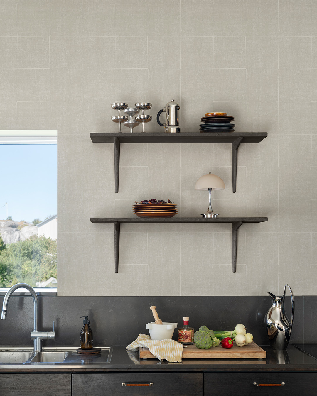 The light grey wallpaper Göteborg, translated Gothenburg, features a quiet grid that spreads across the wall. Generous squares sit side by side in a thoughtful interplay of lines and subtle shifts, where each junction marks a new direction. Here, order and movement meet in a balanced composition that gives the room structure without overpowering it. The textile-like surface, with its almost linen-like character, softens the graphic expression. The discreet spaces between the forms enhance the sense of layering, as if something were hidden just behind the first surface.