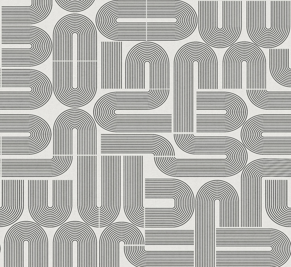 In this black-and-white interpretation of the Liverpool mural wallpaper, the architectural character of the lines emerges with striking clarity. The graphic arches and curves move across the surface like a carefully designed system of roads, connected, interrupted and resumed in a continuous flow. The dark lines against the light grey background, with its subtle textile texture, create a distinct contrast that enhances the sense of structure and precision. In this colourway, Liverpool feels confident and timeless, a statement with a clear presence, where artistic flow meets refined, almost monochrome elegance. This wallpaper is a mural wallpaper with fixed dimensions. One roll contains 6 panels, each measuring 2.7 m × 0.49 m per panel. The wallpaper is repeatable.
