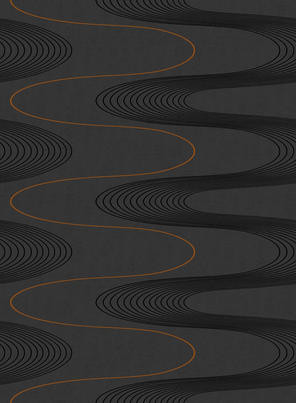 In the Malaga mural wallpaper, the lines move through the room like muted tones, like sound waves slowly spreading through the darkness. The deep dark brown background gives the pattern a velvety weight, while black parallel lines sweep forward in soft arches, creating a pulsing flow across the wall. At the centre of this harmony runs a warm burnt-orange line, independent and self-assured. It winds through the composition like a glowing nerve, breaking the rhythm and giving the pattern its distinctive character. In the meeting between the strict black lines and the warm accent, a dynamic emerges that feels both modern and expressive. This wallpaper is a mural wallpaper with fixed dimensions. One roll contains 4 panels, each measuring 2.7 m x 0.49 m per panel.