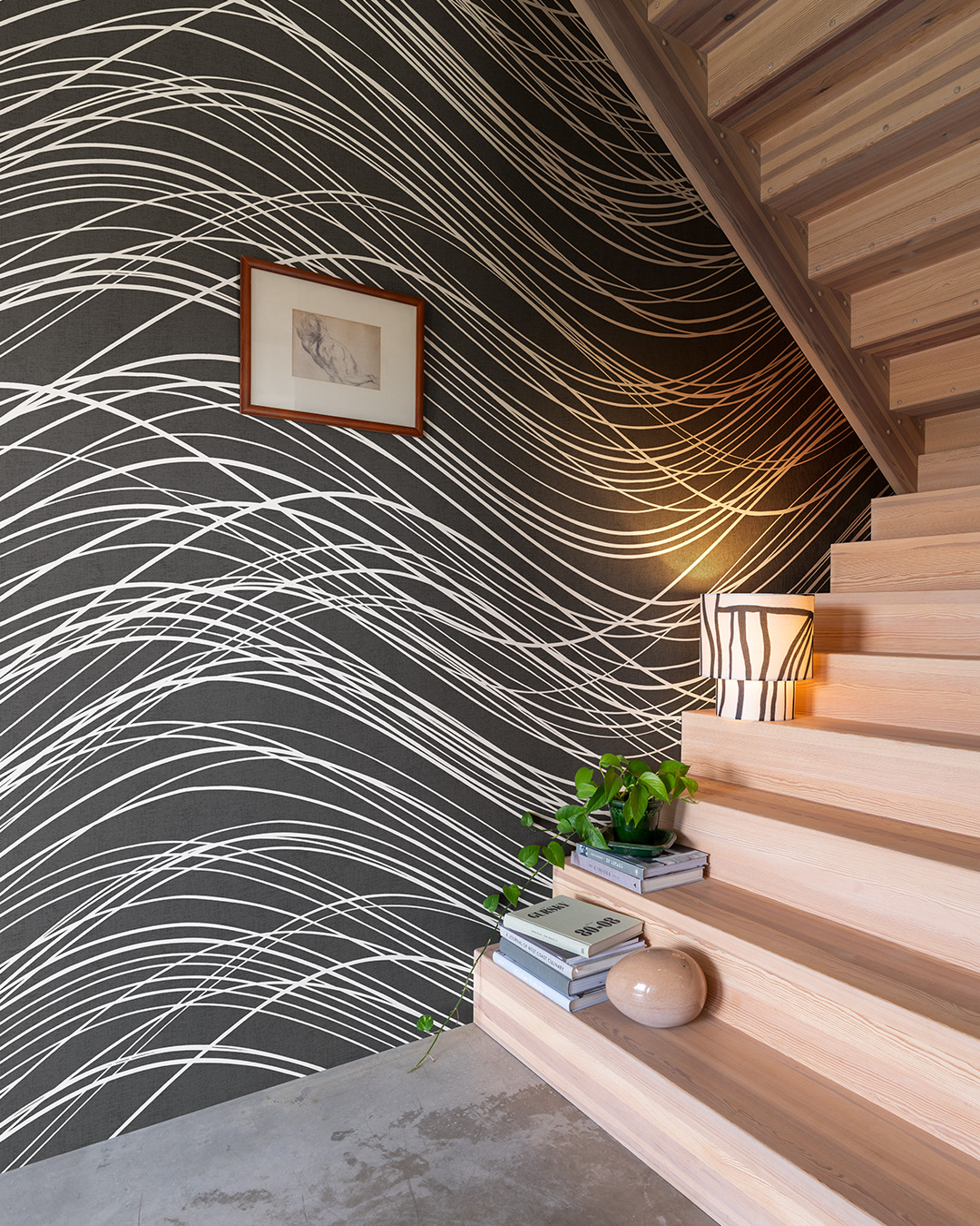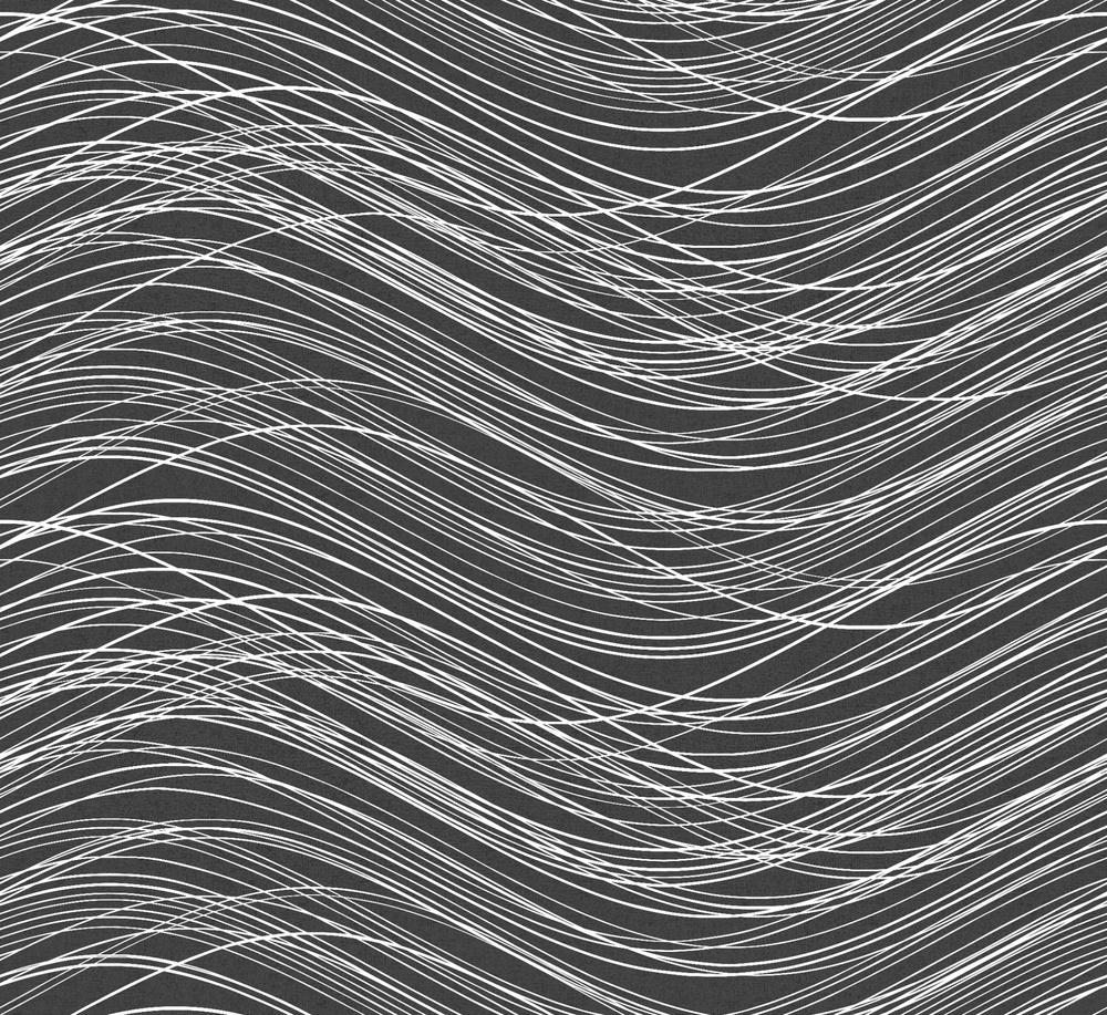 In this colourway of the Nice mural wallpaper, the waves emerge with clear contrast and a confident presence. The white lines move across the dark background in a flowing rhythm, reminiscent of the wind sweeping across the open sea or strands of light tracing their own path through the dusk. The lines cross, merge and break apart in an ongoing dialogue. Here, the movement becomes more dramatic, more intense. The dark, almost black background adds depth and weight, while the bright strokes create life and energy. Together they form a pattern that feels both powerful and poetic. This wallpaper is a mural wallpaper with fixed dimensions. One roll contains 6 panels, each measuring 2.7 m × 0.49 m per panel. The wallpaper is repeatable.