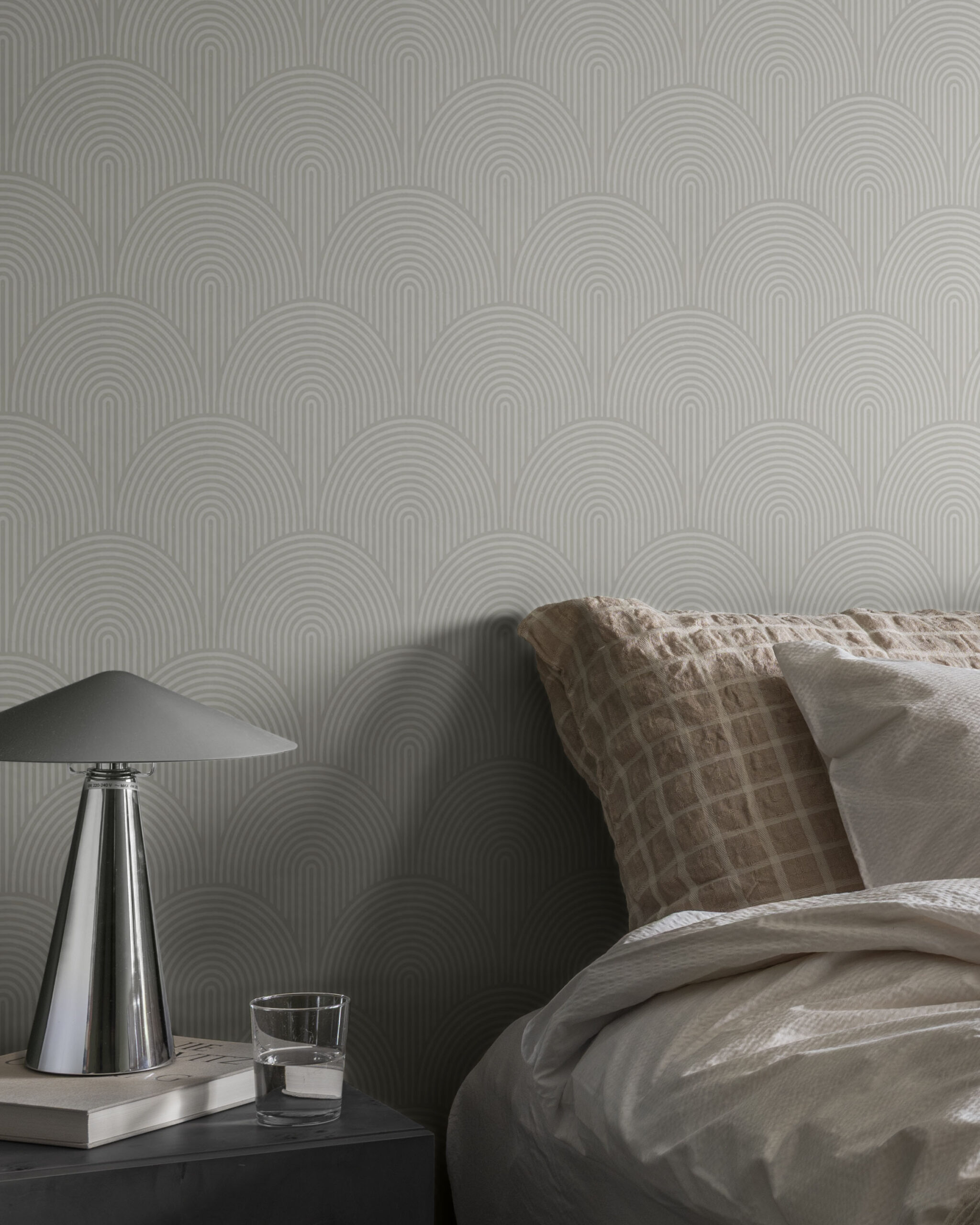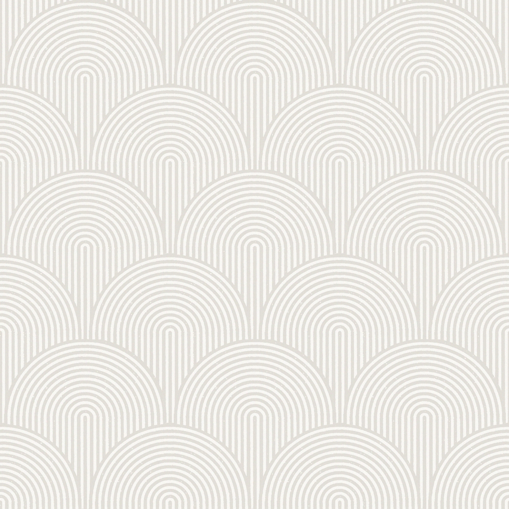 Like a quiet sunrise repeating along the horizon, the soft arches unfold in a harmonious rhythm. Line after line follows the next, forming a pattern that moves across the wall with effortless elegance. The light, natural white background together with the soft white lines creates a subtle tone-on-tone effect. The overall impression is balanced and calming, yet still alive. The repeating arches evoke the spirit of Art Deco architecture. A wallpaper that gives the room a gentle graphic character and allows the light to move softly across its rhythmic interplay of forms.