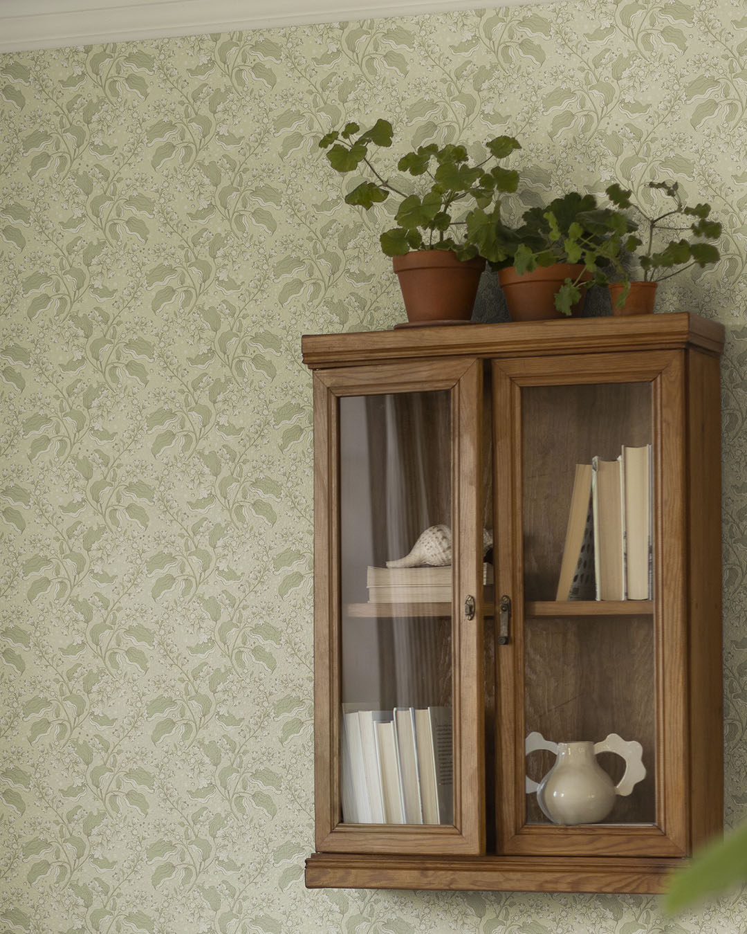 In this soft green wallpaper, the fragrant lilac blooms in full force. The Syrén wallpaper transports you to the early days of summer, when evenings are at their brightest, leisurely days await, and warm breezes drift by. Against a pale green background, the lilac’s leaves and blossoms in green and white intertwine, bringing an airy and tranquil atmosphere to the room.