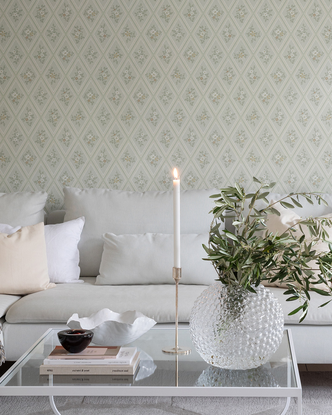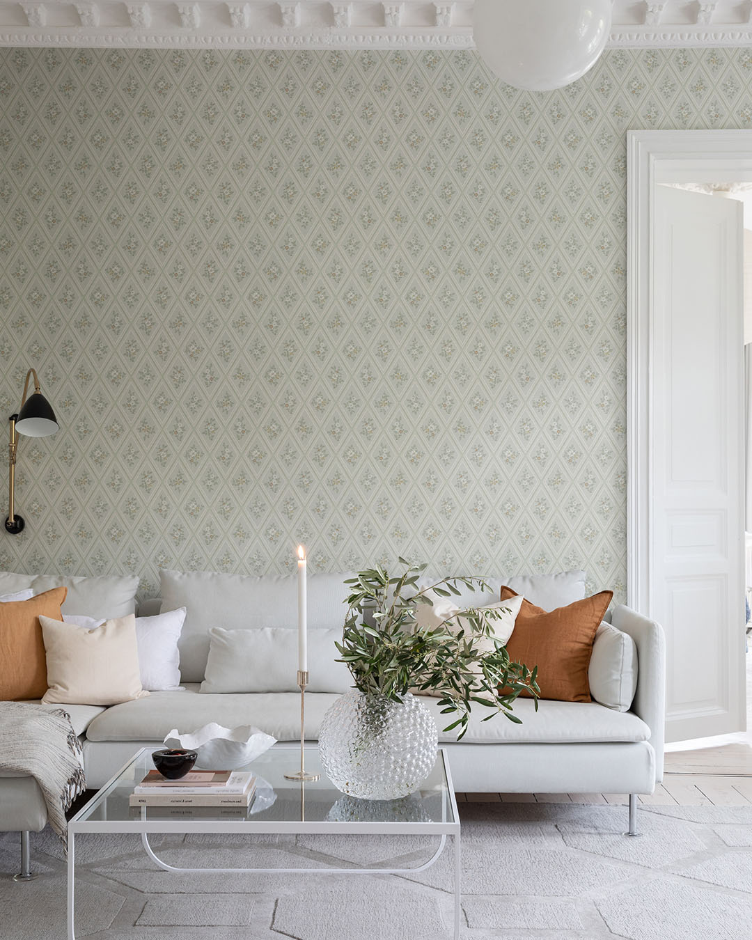 A traditional geometric pattern with a touch of romantic elegance. This typical Swedish trellis pattern flourished during the second half of the 19th century. In this reinterpretation, each square is decorated with similar, yet unique flower bouquets, creating a subtle variation in the pattern. Here you can see different shades of green decorated with white, lilac and red flowers.