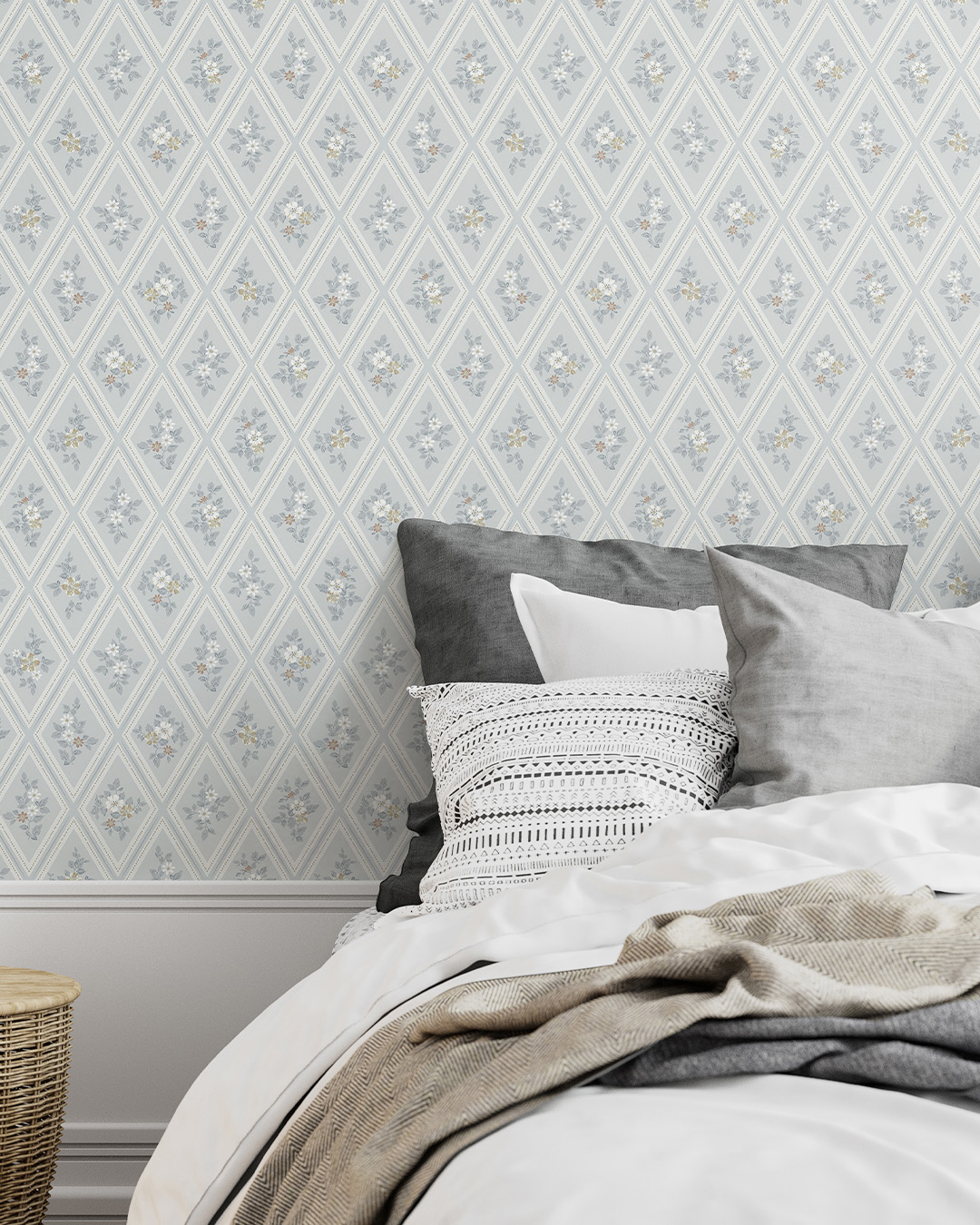 Pleasant blue with hints of gray tones is the bottom color of this charming wallpaper Trellis. In the pattern you see small bouquets, similar to each other but still different, which creates a wonderfully dynamic impression in the room.
