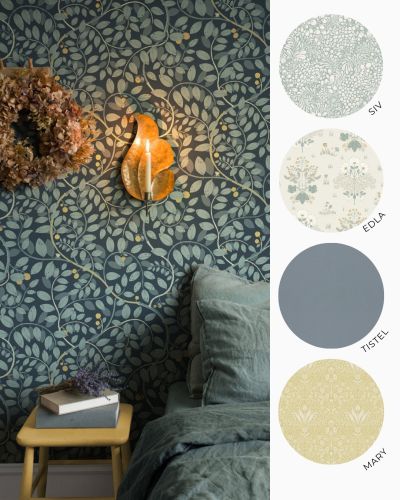 I bilden nedan har man använt den ljusa accentfärgen i tapeten och målat både golv- och taklister samt dörr med en denna nyans. En tapet som Wilma är perfekt för dig som kanske tycker tapet med mycket, och stora mönster är lite läskigt. Denna tapet ger dig möjlighet att doppa tårna utan att behöva gå all in. Mönstret blir lugnt även fast mönsterbilden både är stor och detaljrik.