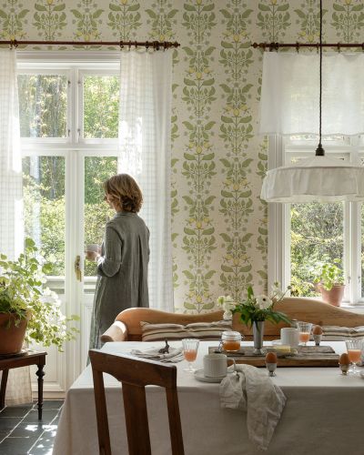 Marys tidlösa mönster består av tulpaner, tusenskönor och slingrande bladverk som tillsammans skapar en lugn och vilsam bas till rummets alla väggar. Med tapetens mjuka kontraster upplevs nästan väggen enfärgad på långt håll. Desto närmre du kommer, ju mer intresse och liv får tapeten.