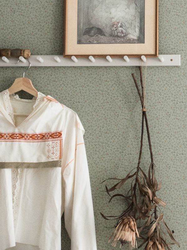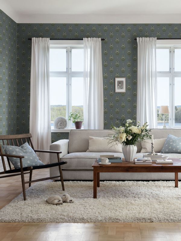 I tapetmönstren tar trenden form genom bågar, cirkulära element och mjukt rundade linjespel. Här handlar det om att låta mönstret följa samma rörelse som syns i möblernas konturer. En visuell dans av välvda former som skapar ett mjukt flöde genom rummet. Kurvorna får gärna vara generösa och rytmiska, så att väggen känns levande men samtidigt balanserad.