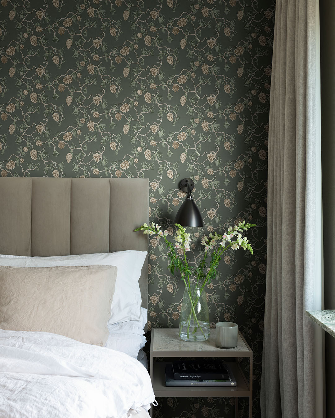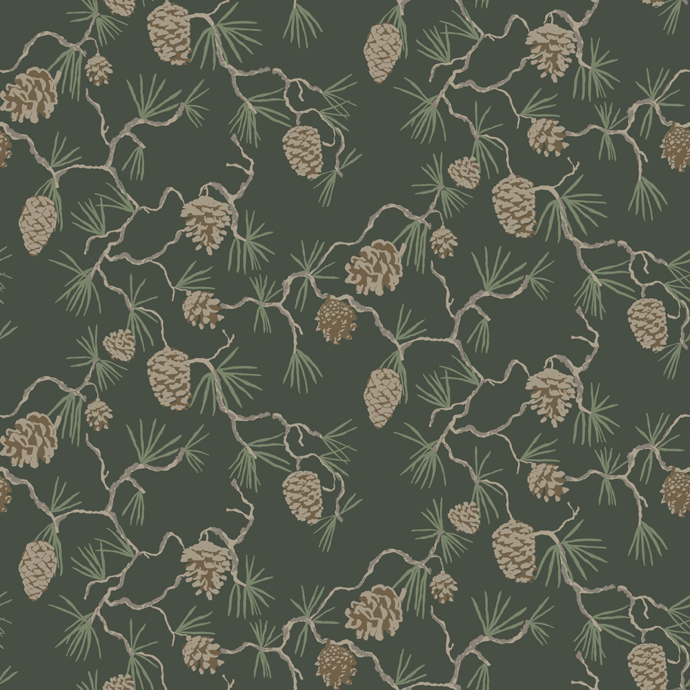 I tapeten Tallskog vill du, likt i en riktig tallskog, dröja dig kvar länge. Här råder vindens sus, doften av fuktig mossa och naturens dämpade sång när olika ljud hamroniskt blandas samman. På en mörkgrön botten växer tallens sega grenar i nyanser av brunt och grönt. Tapeten skapar ett behagligt lugn och ger dig en plats för återhämtning.