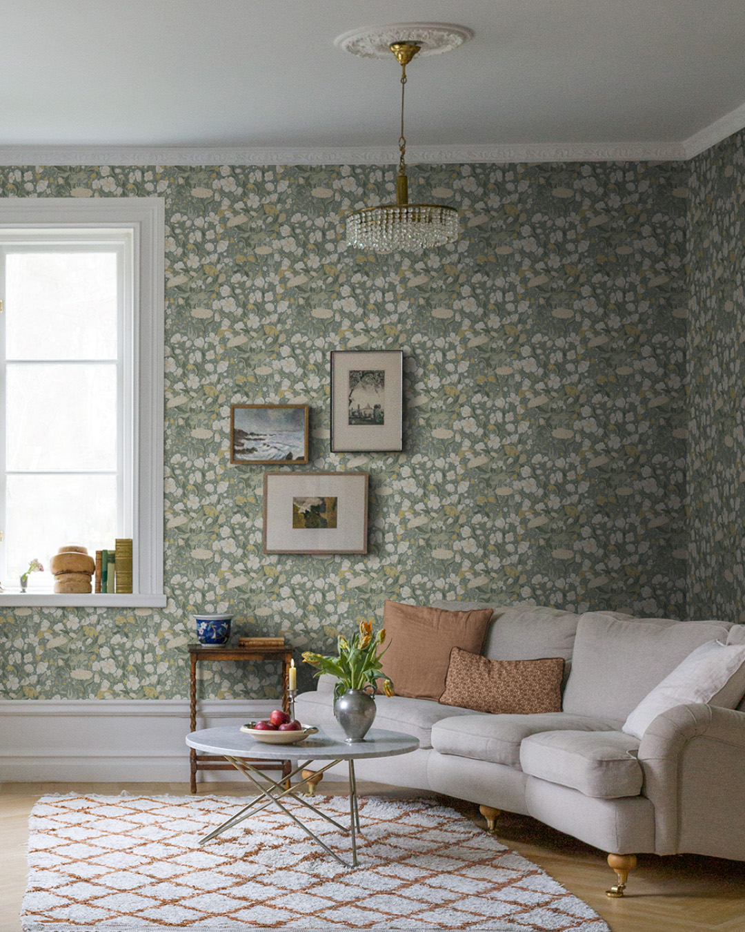 Vår allas favorit, grönt. Här i en magisk färgskala av nedtonade gröna nyanser som kompletteras vackert av ljusgula och vit-beige blommor. Tapeten Hava har ett lugn som i kombination med magiska färgsättningar ger utrymme för återhämtning och avkoppling.