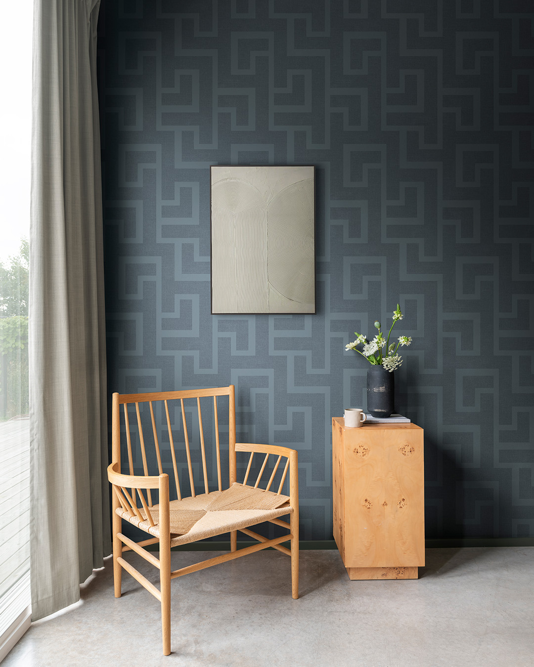 I tapeten Amsterdam vecklar mönstret ut sig som skymningens stadskarta i svala, dova blågrå toner. Linjerna löper med lågmäld precision, svänger mjukt och fortsätter vidare som tysta gator mellan stilla kvarter. Här finns en rytm som inte stressar, utan leder blicken vidare i ett lugnt, sammanhängande flöde. Den mörkare onmrådena i tapeten har en textilliknande yta som ger en djup, taktil känsla. En tapet som skapar en sval och balanserad atmosfär, där struktur och geometri samspelar och låter rummet vila i ett stillsamt, sofistikerat uttryck.
