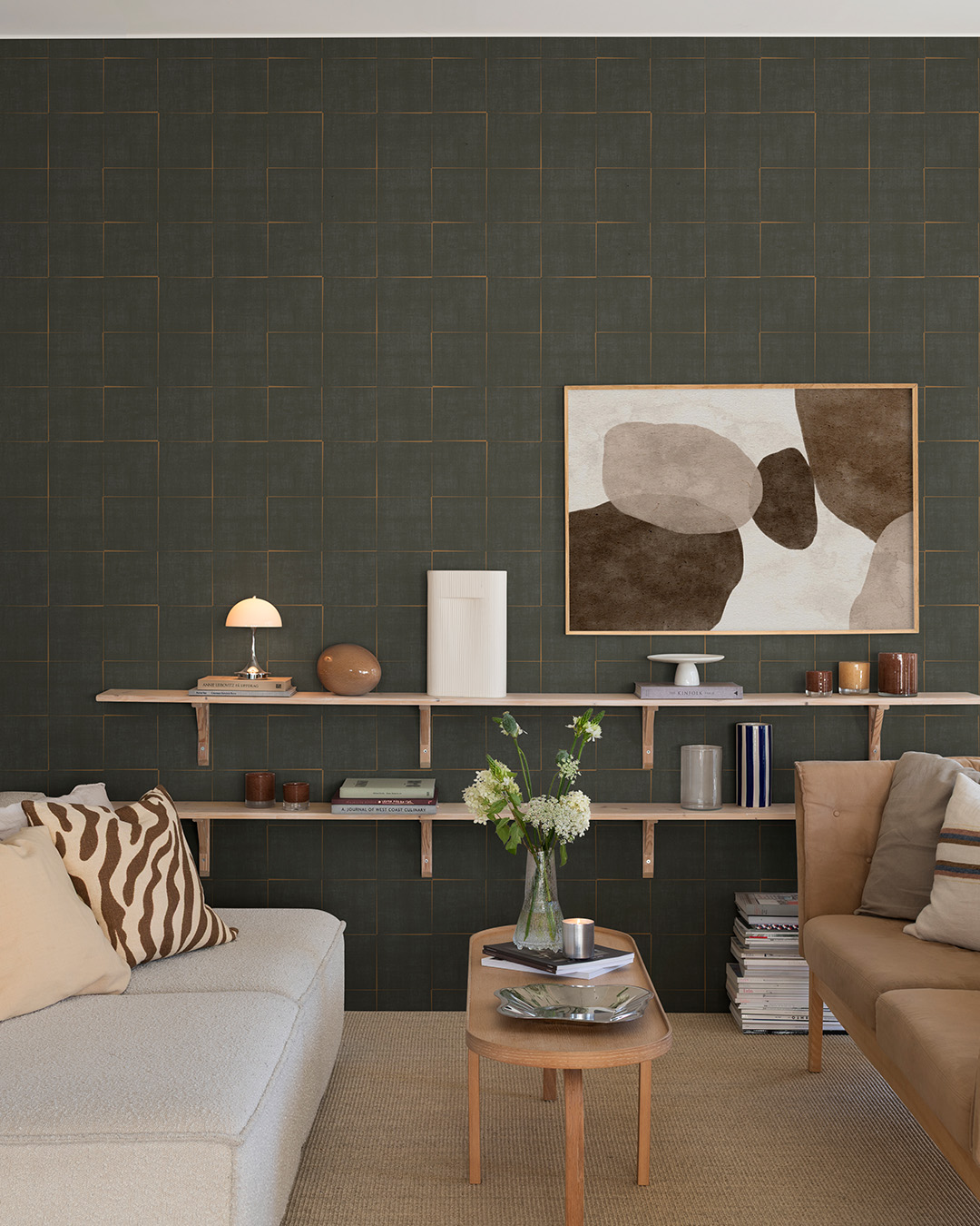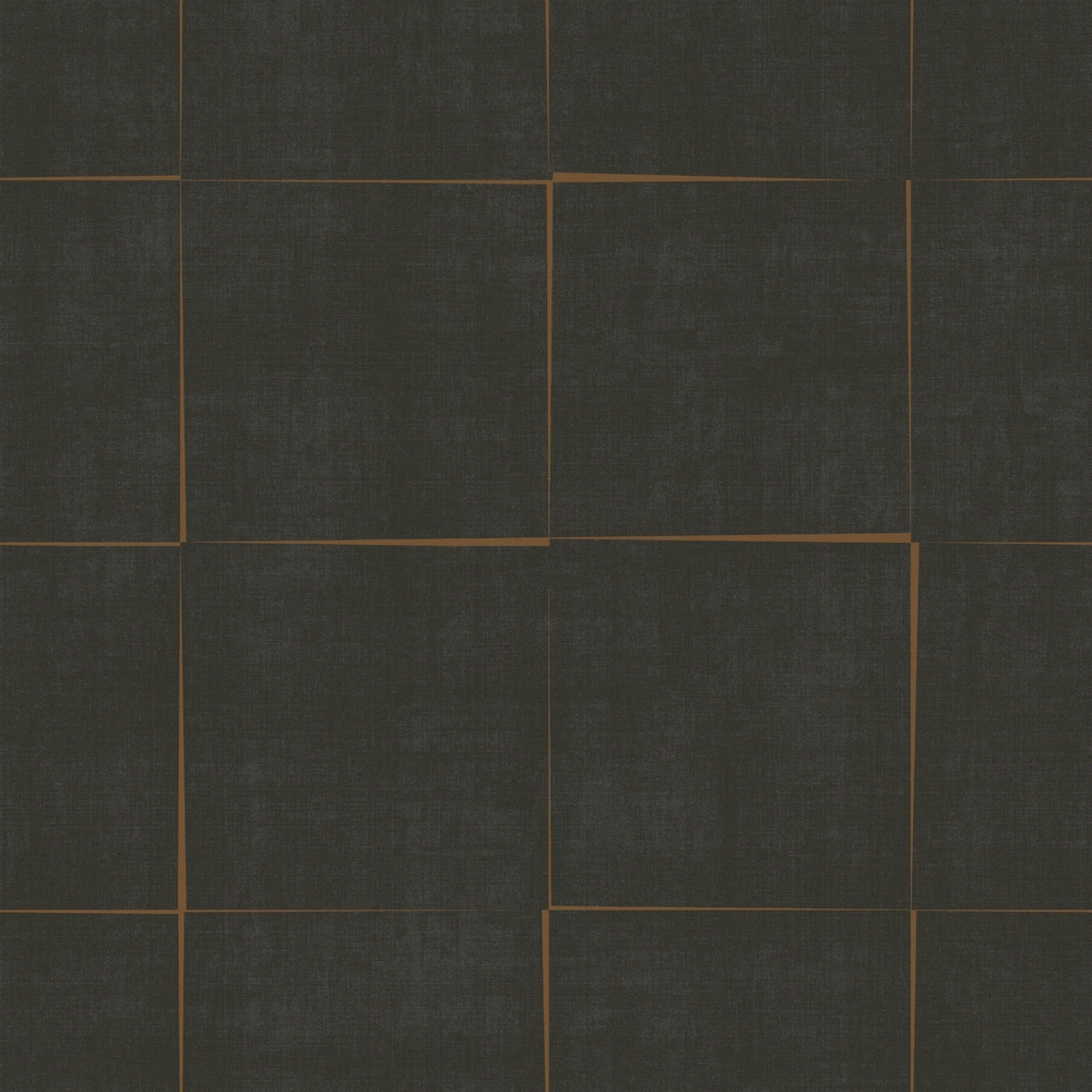 Som skymningen över en stilla stad breder detta rutmönster ut sig i en djup, svartbrun ton. De generösa kvadraterna ligger förskjutna mot varandra och skapar ett spel av linjer och vinklar där det strikta möter det oväntade. Här uppstår små mellanrum i kopparmetallic, diskreta pauser i det grafiska som låter mönstret andas och ger väggen liv. Den mörka botten har en textil struktur som för tankarna till grovt linne eller borstad canvas. De varma, kopparliknande linjerna som ramar in rutorna lyser mjukt mot djupet och skapar en elegant kontrast. Ton-i-ton-känslan finns kvar i helheten, men förstärks här av ett mer dramatiskt djup.