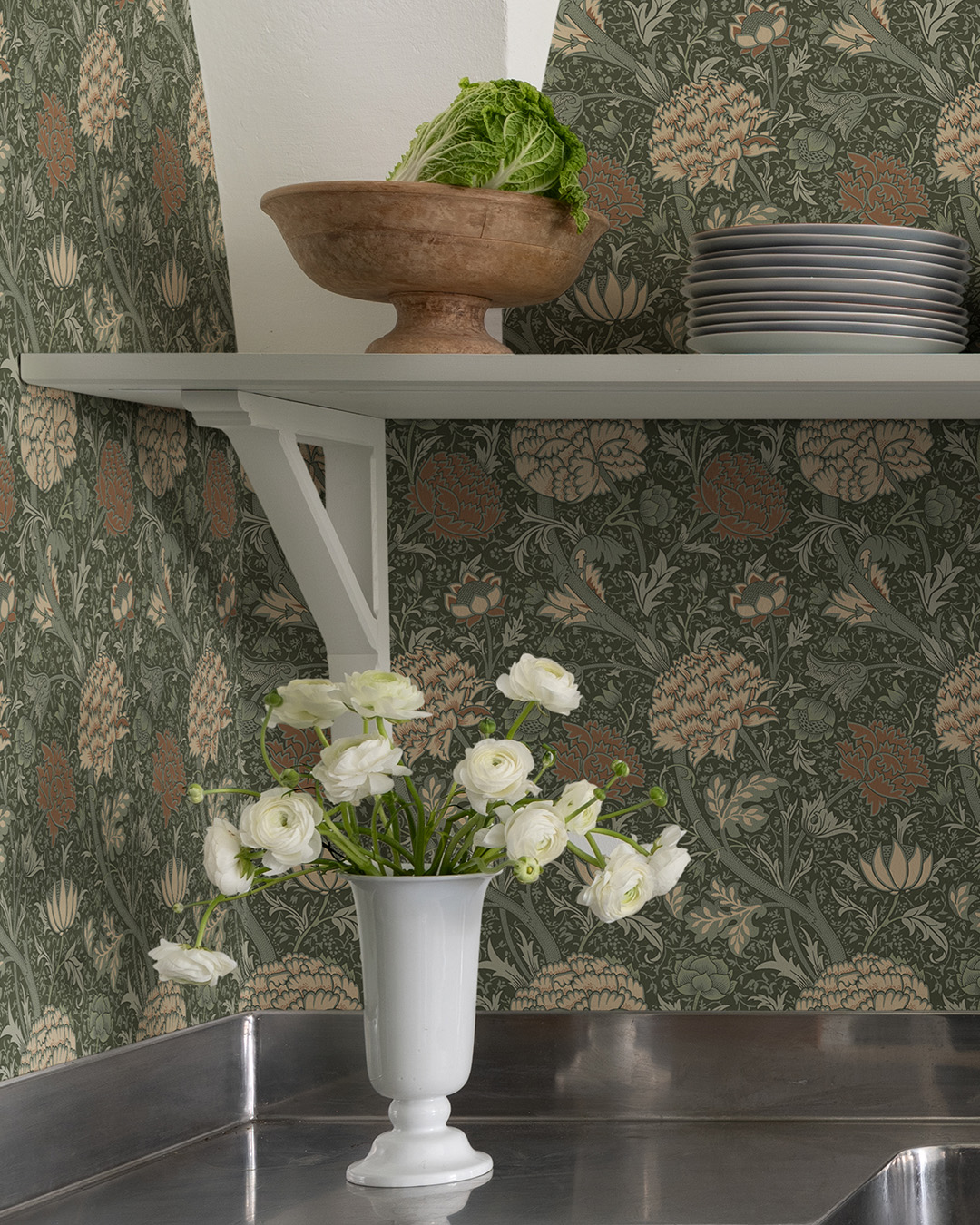 Likt en sakta slingrande flod växer magnifika blommor och blad i slingrande rörelser längs väggarna på tapeten Cray. På en mörk grågrön botten poppar mönstret ut en aning men skapar med sina lugna nyanser av nude och dov terrakotta ändå ett väldigt mjukt intryck. Ett äkta William Morris mönster som är både behagligt och inbjudande, skapades år 1884.