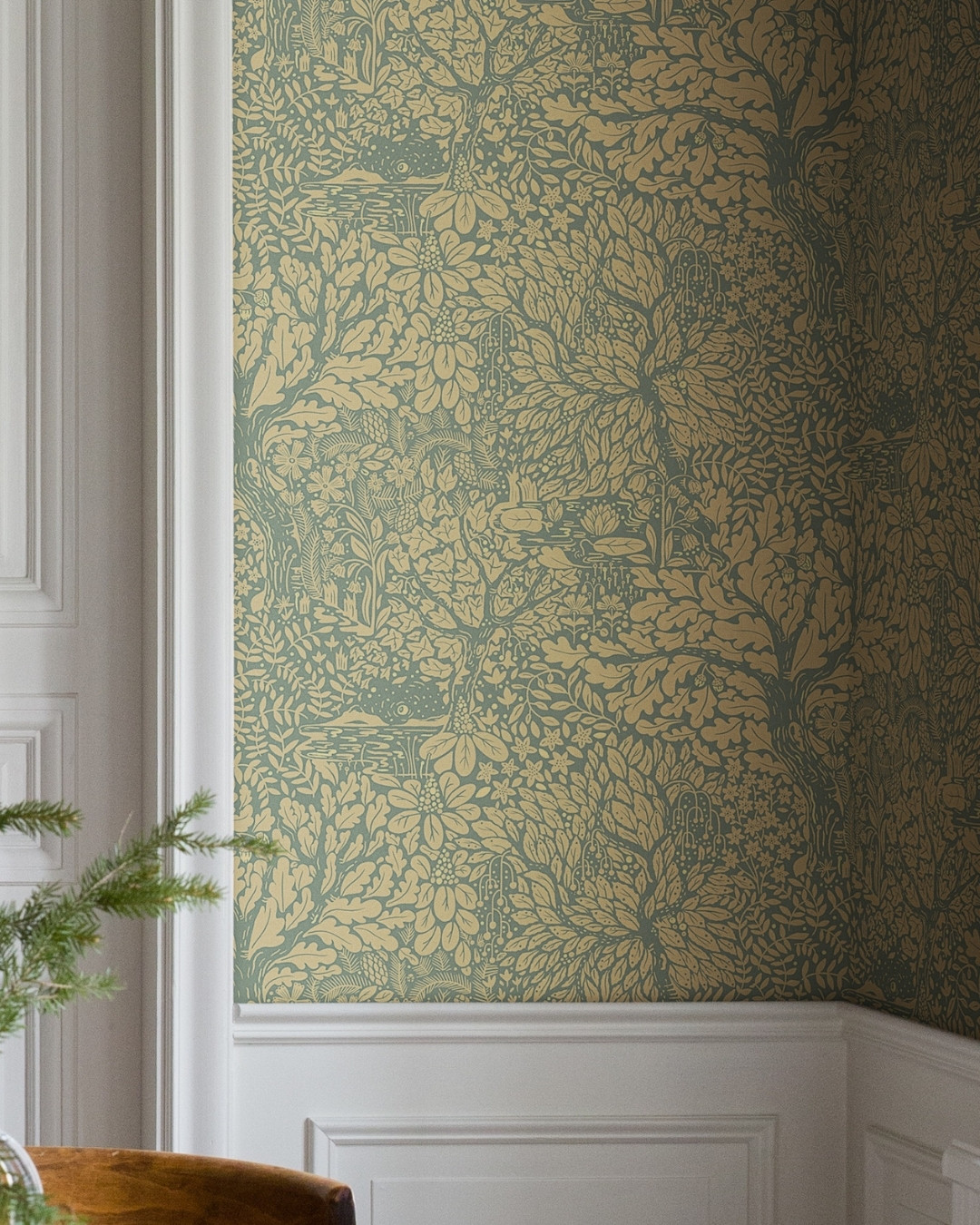 Från urskog till björkarnas glesa skogsdungar - Tapeten Olle är inspirerat av Sveriges olika skogslandskap med dess sjöar och tjärn. I denna färgställning ser du små blommor, blad och ekollon i gult mot en grönblå botten. Olle finns även i fler färgställningar. Tapeten är ritad av illustratören Lina Schnaufer.