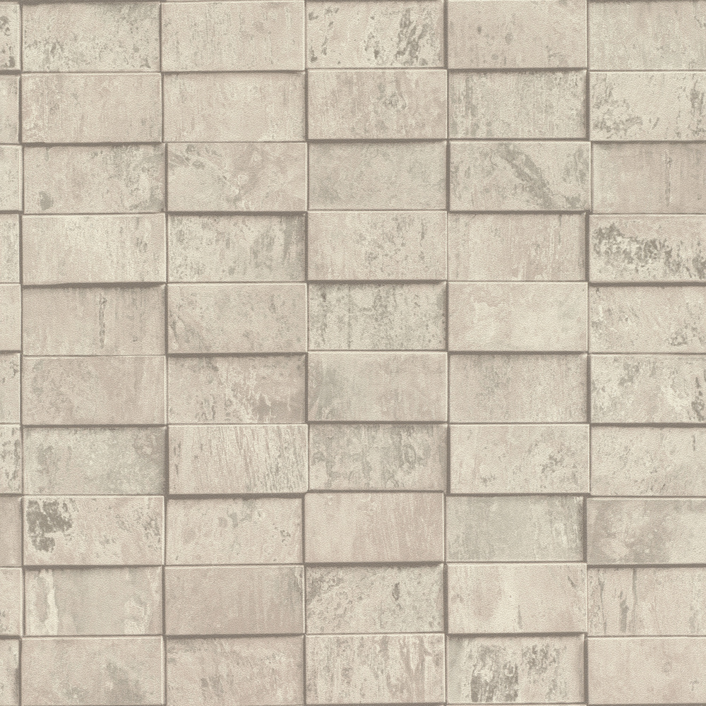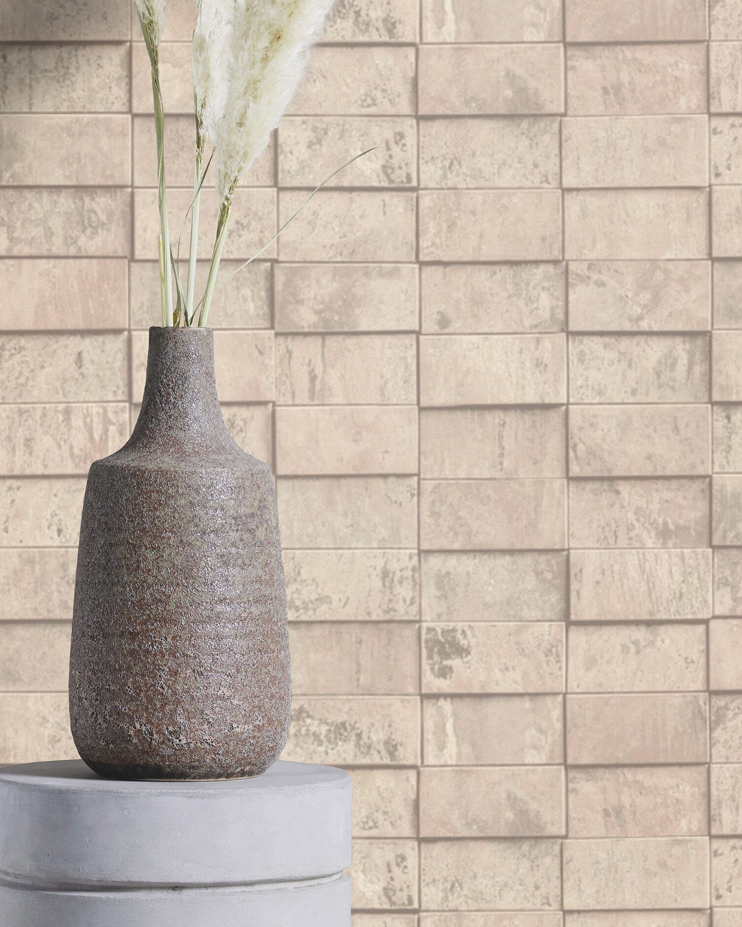 Beige tapet med ett kakelinspirerat rutmönster som ger en mjuk, industriell känsla med lätt patinerad yta.