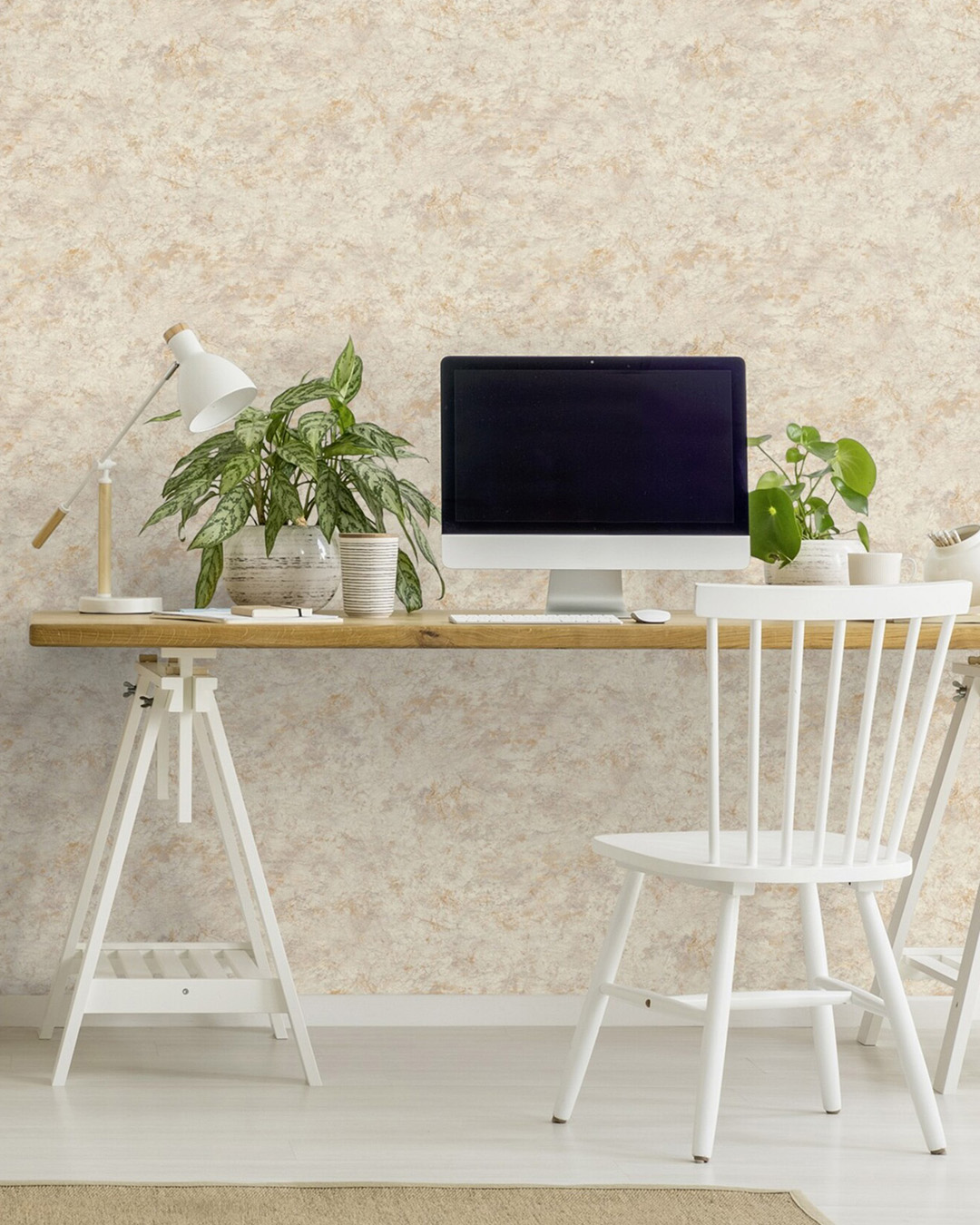 Beige tapet med ett mjukt marmormönster och diskreta guldskiftningar som ger en elegant och varm känsla.