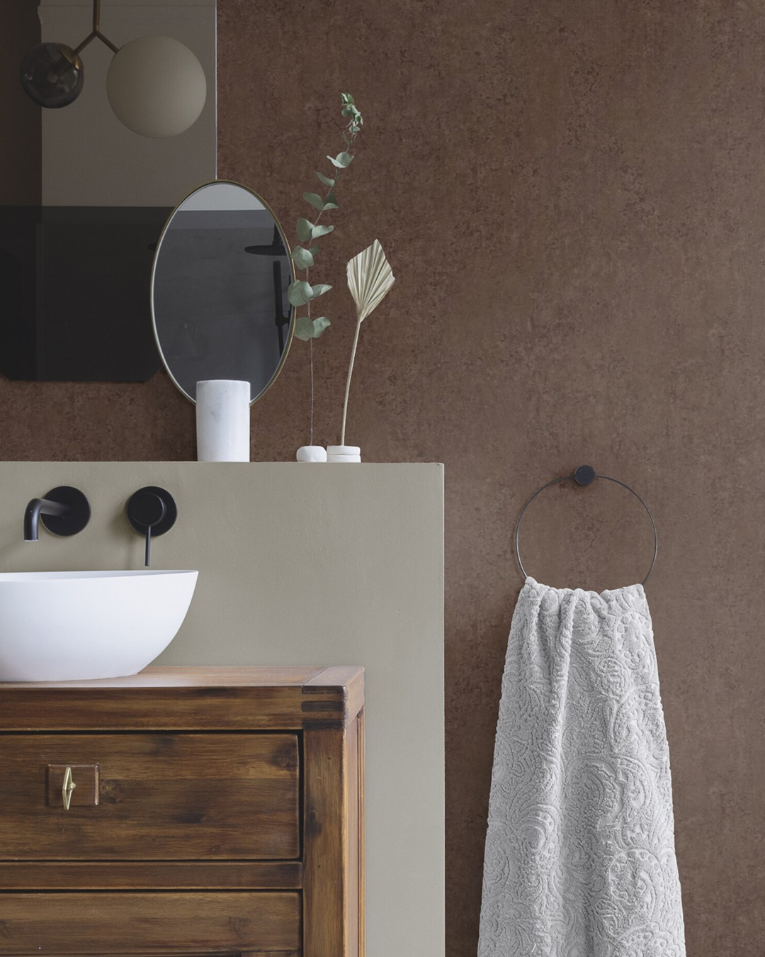Mörkbrun tapet med en rå betongkänsla och lätt patinerad struktur som ger rummet ett modernt, industriellt uttryck.