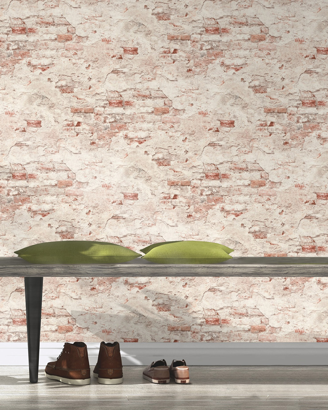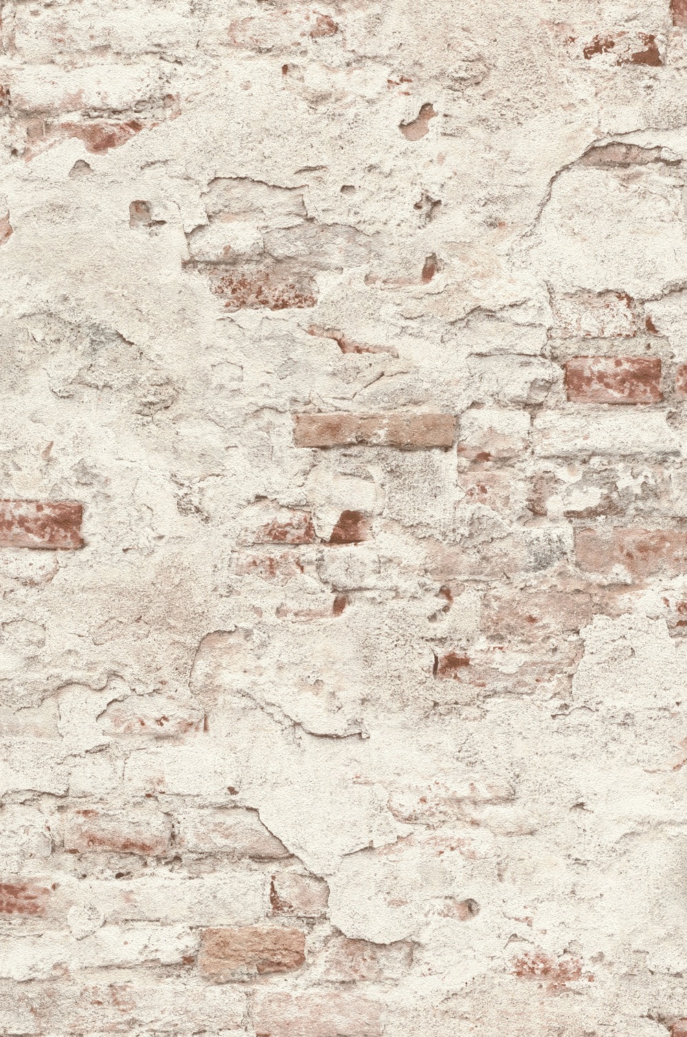 Vit tapet med sliten putsad tegelvägg i ljusa nyanser som skapar en rustik och vintageinspirerad känsla.
