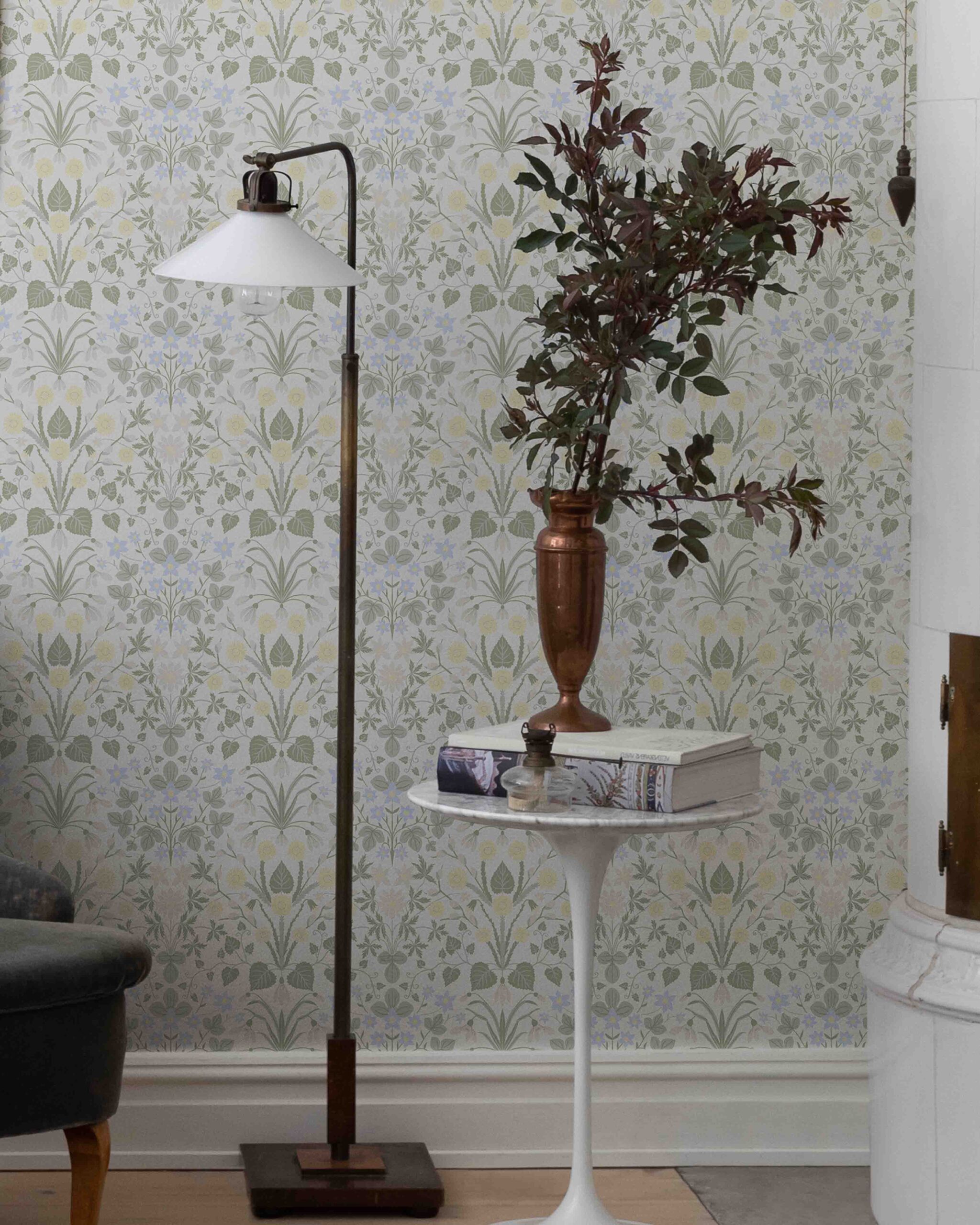 Vårkänslorna spritter i hela kroppen när tussilagon, blåklockan och snödroppen börjar titta fram längs med vägkanten. I mönstret Vårblommor bildar blommorna tillsammans ett ljuvligt medaljongliknande mönster i ljusa toner av gult, grönt, blått och mot en vit botten.