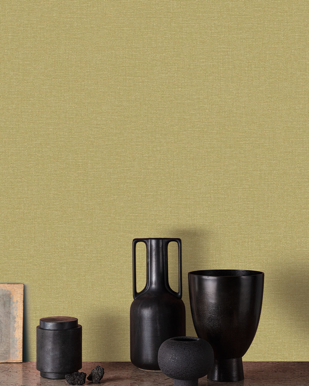 Råggul tapet med gröna inslag och textilliknande yta som ger ett levande och ombonat intryck.