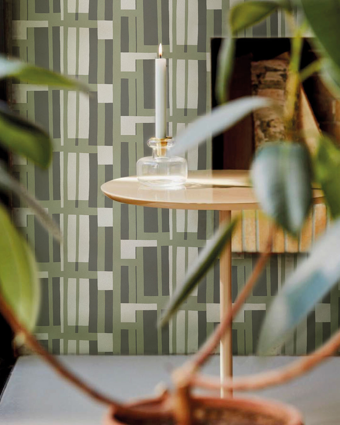Tapet Attika från Marimekko är en harmonisk och stilfull design som kombinerar arkitektoniska influenser med ett modernt grafiskt uttryck. Mönstret består av ett rutnät eller ett system av upprepade geometriska former, ofta inspirerat av klassisk arkitektur och labyrinter, vilket ger en tidlös men ändå lekfull känsla. I denna färgställning med nyanser av vitt, dov grönt och grått skapas en mjuk och balanserad palett som känns både naturlig och sofistikerad.