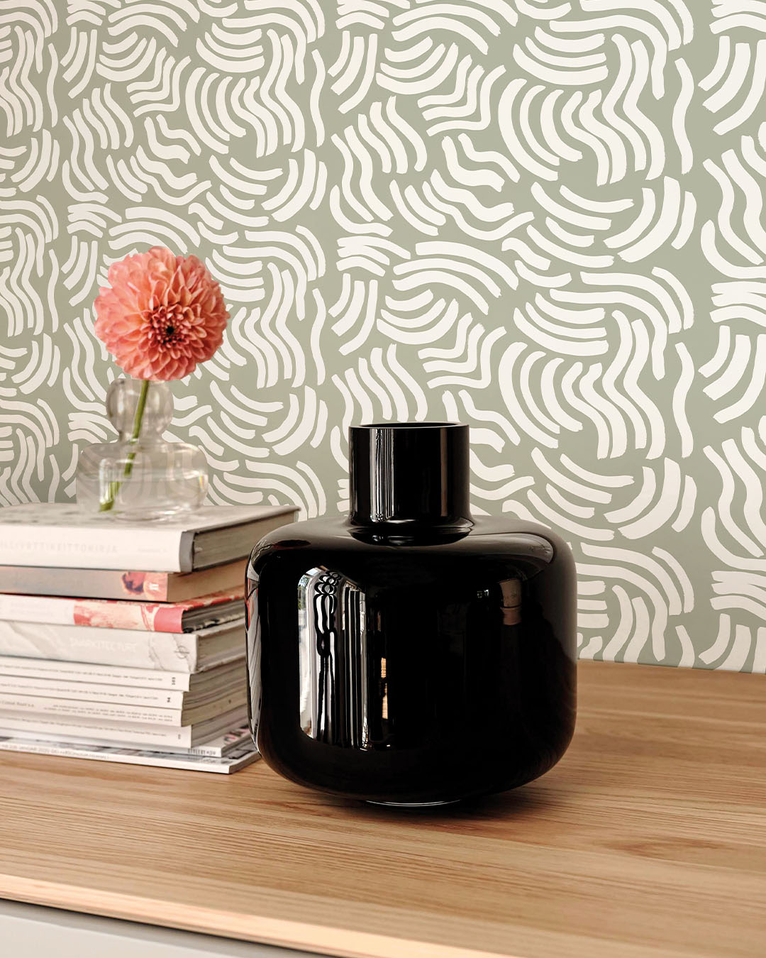 Tapet Hyräily från Marimekko har en poetisk och lugn design som på ett subtilt sätt förmedlar känslan av ljud och rörelse. Den dova gröna bottenkulören ger ett mjukt och jordnära uttryck, medan de vita vågorna på ytan för tankarna till ljudvågor de böljande linjerna minner om ett mjukt nynnande eller flödande toner. Mönstrets rytmiska rörelse skapar en känsla av stillsam energi, som om ljudet var fångat i tapetens textur.
