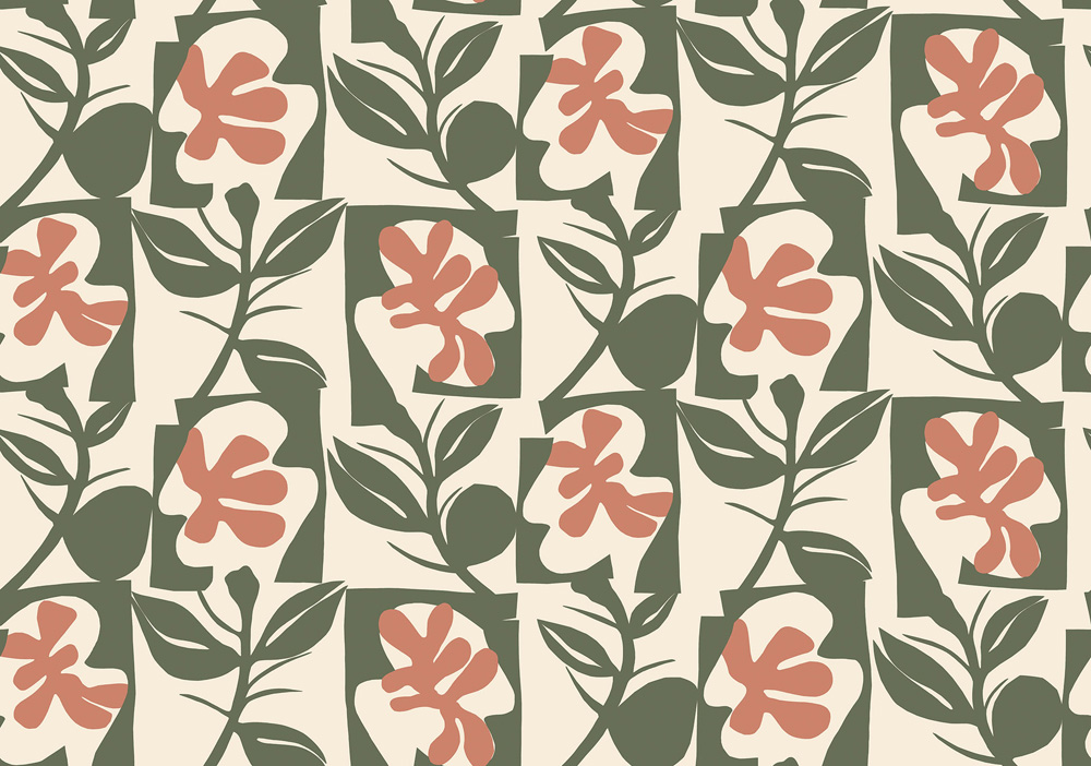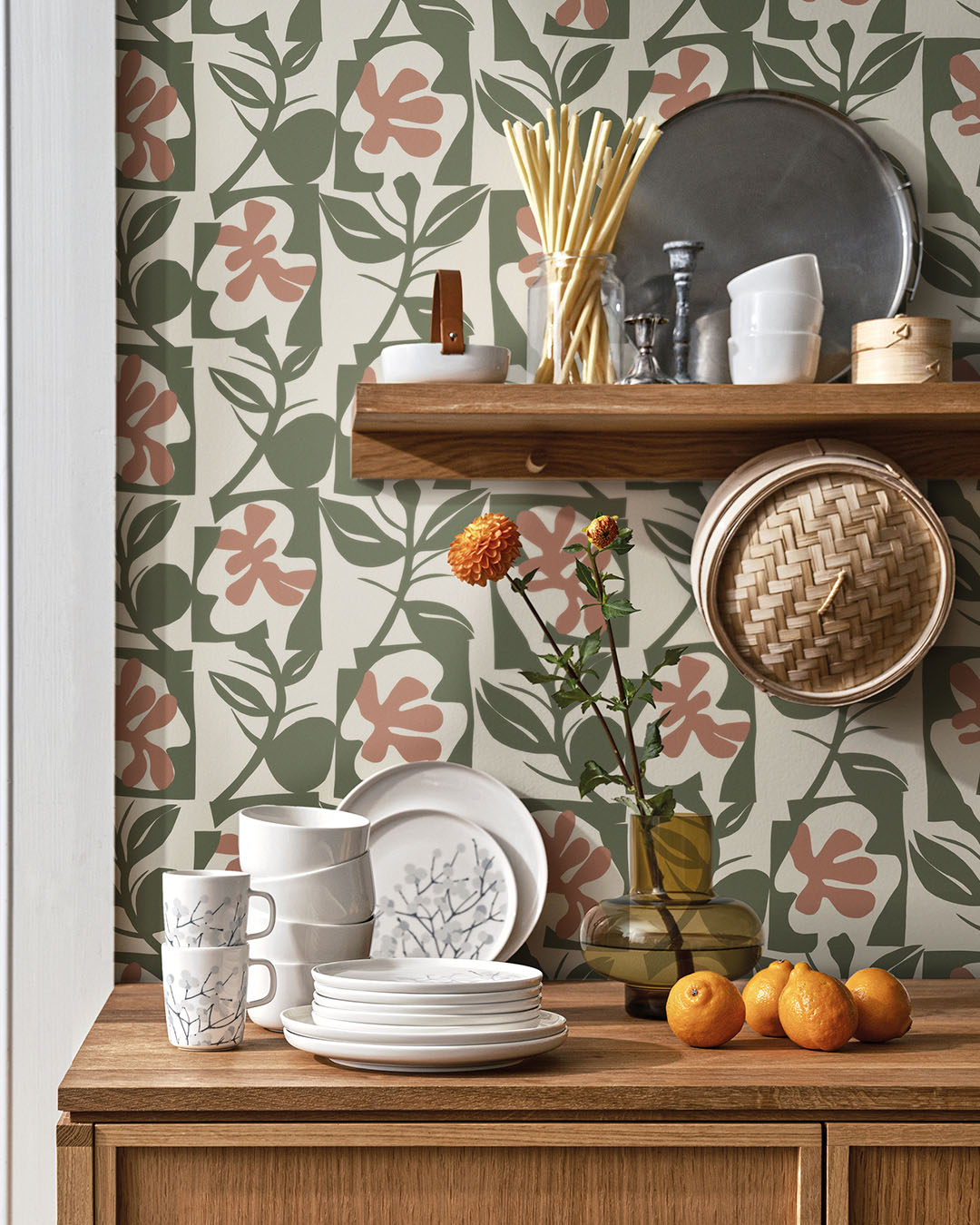 Tapet Pienet Naatit från Marimekko har ett mjukt, naturinspirerat uttryck där stiliserade växtformer breder ut sig i ett lekfullt men harmoniskt mönster. Den krämvita botten ger ett ljust och luftigt intryck, medan trycket i grågrönt och korall skapar en fin balans mellan det svala och det varma. Mönstret känns handritat och organiskt, med en enkelhet som för tankarna till trädgårdens bladverk i ett grafiskt och samtida formspråk.