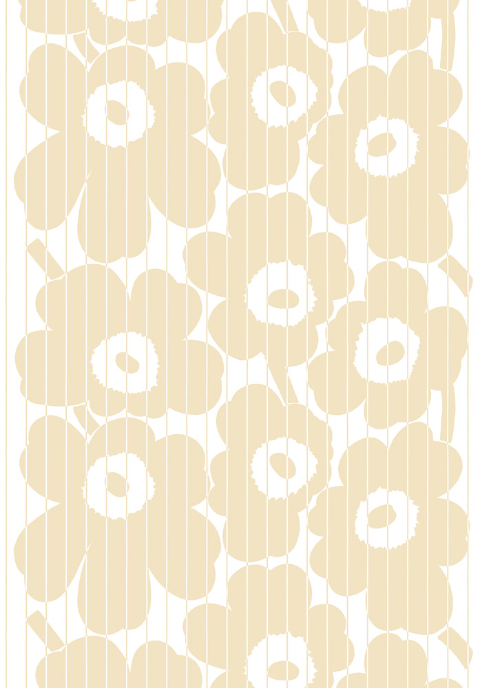 Tapet Vesi Unikko från Marimekko är en väggpanel där det klassiska mönstret Unikko har fått en spännande tolkning där vertikala linjer som går över mönstret förskjuter mönstrets färger ock skapar en randig effekt. I denna färgställning möter en vit botten en mild smörgul ton och de stora Unikko blommorna får ett nedtonat och milt uttryck.