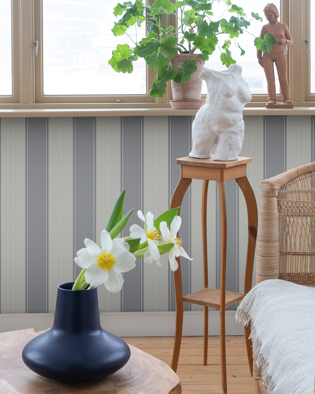 Fred är en blå randig tapet där den behagliga blågrå nyansen och de raka linjerna fyller rummet med en enkel fridfullhet. Material som ljusa träslag, kalla metaller i form av silver eller stål och lergods i ljusa neutrala nyanser harmonierar fint ihop med den blå kulören. Ett rum med en klassisk rand som Fred kombineras även fint ihop med andra rum tapetserade med slingrande blommor eller diskreta mönster.