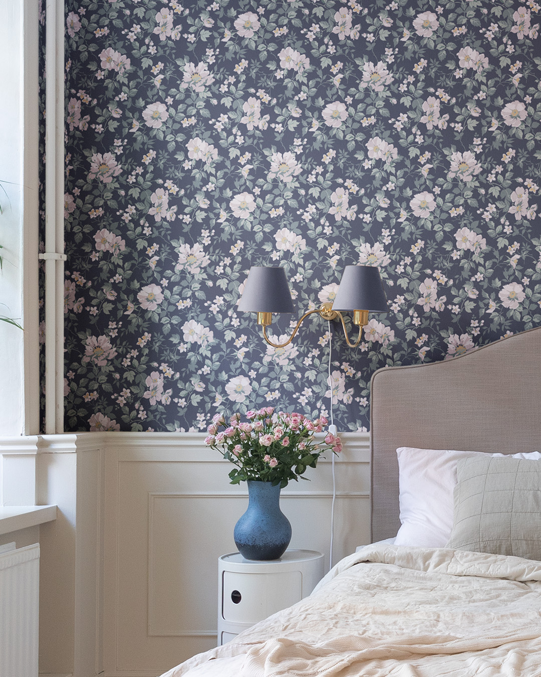När den oändligt vackra nyponrosen slår ut sina ljusrosa små knoppar sjuder det av liv när humlor och bin flyger från blomma till blomma. Försommaren är här och bjuder på ljus och hopp. Tapet Johanna, med sitt mönster av nyponros, skapar denna hoppfulla atmosfär i rummet. Med en vacker mörkblå färgställning, rosa blommor och grågröna blad skapas en behaglig och mysig känsla i hemmet.