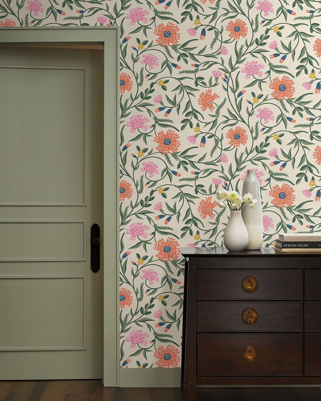 Tapet Aster är en dekorativ blomtapet med slingrande rankor som ramar in stiliserade asterblommor. De större blommorna går i klara nyanser av rosa och orange och de mindre i rosa och gult. Knopparna är i nyanser av blått och orange och omges av smala blad i dämpade oliv- och salviagröna toner. Allt ligger mot en cremevit botten som gör mönstret ljust och luftigt. Helhetsintrycket är fräscht och lätt med en handmålad mjuk känsla.
