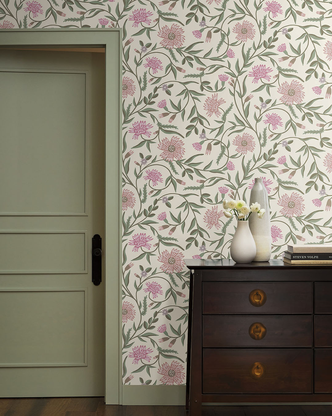 Tapet Aster är en dekorativ blomtapet med slingrande rankor som ramar in stiliserade asterblommor. De större blommorna går i dov rosa nyans och cerise och de mindre i ljuslila. Knopparna är i nyanser av dov rosa och mullvad och omges av smala blad i dämpade gröna toner. Allt ligger mot en vit botten som gör mönstret ljust och luftigt. Helhetsintrycket är mjukt och lätt med en handmålad, naturlig känsla.