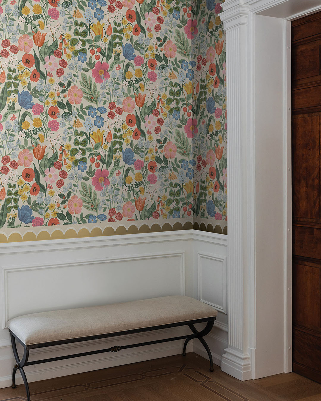 Tapet Blossom är en rik, heltäckande blomtapet med handmålade trädgårdsblommor i olika storlekar och stadier. Här samsas blommor som vallmo, rosor, tulpaner, ringblommor och förgätmigej med körsbär, insprängt bland stora, mjukt svängda blad och kvistar. Botten är varm ljusbeige. Färgskalan är livfull med korall, cerise, vallmorött, gyllengult och blått samt blad i olika nyanser av grönt med tecknade ådringar. Helhetsintrycket är frodigt och lekfullt som en sommarträdgård inomhus med en mjuk, handritad karaktär som känns både varm och inbjudande.