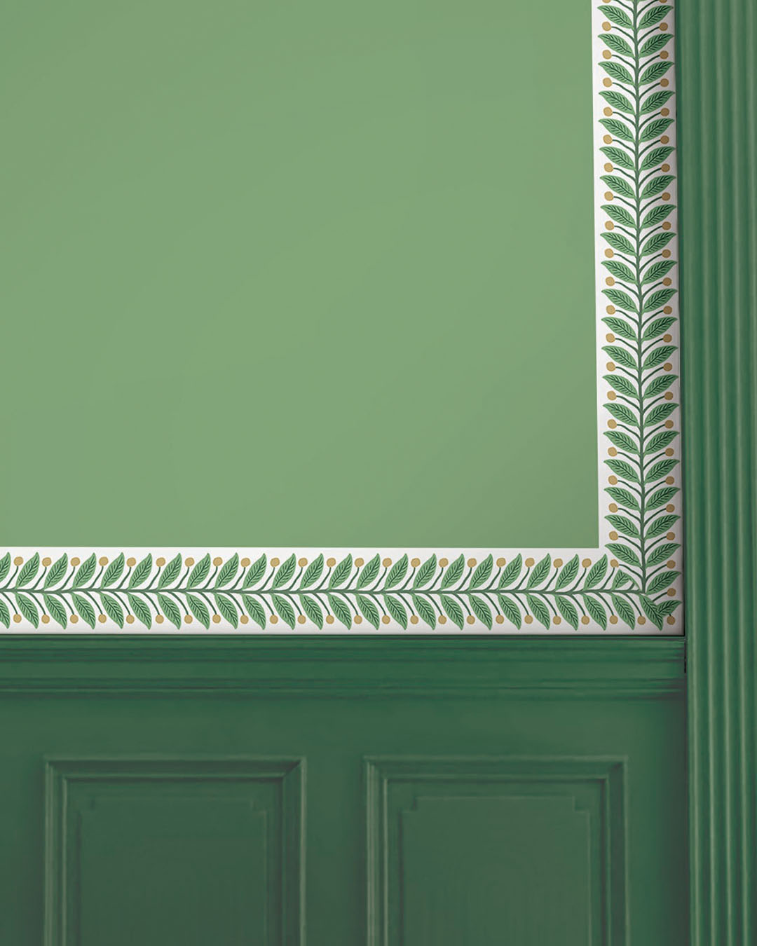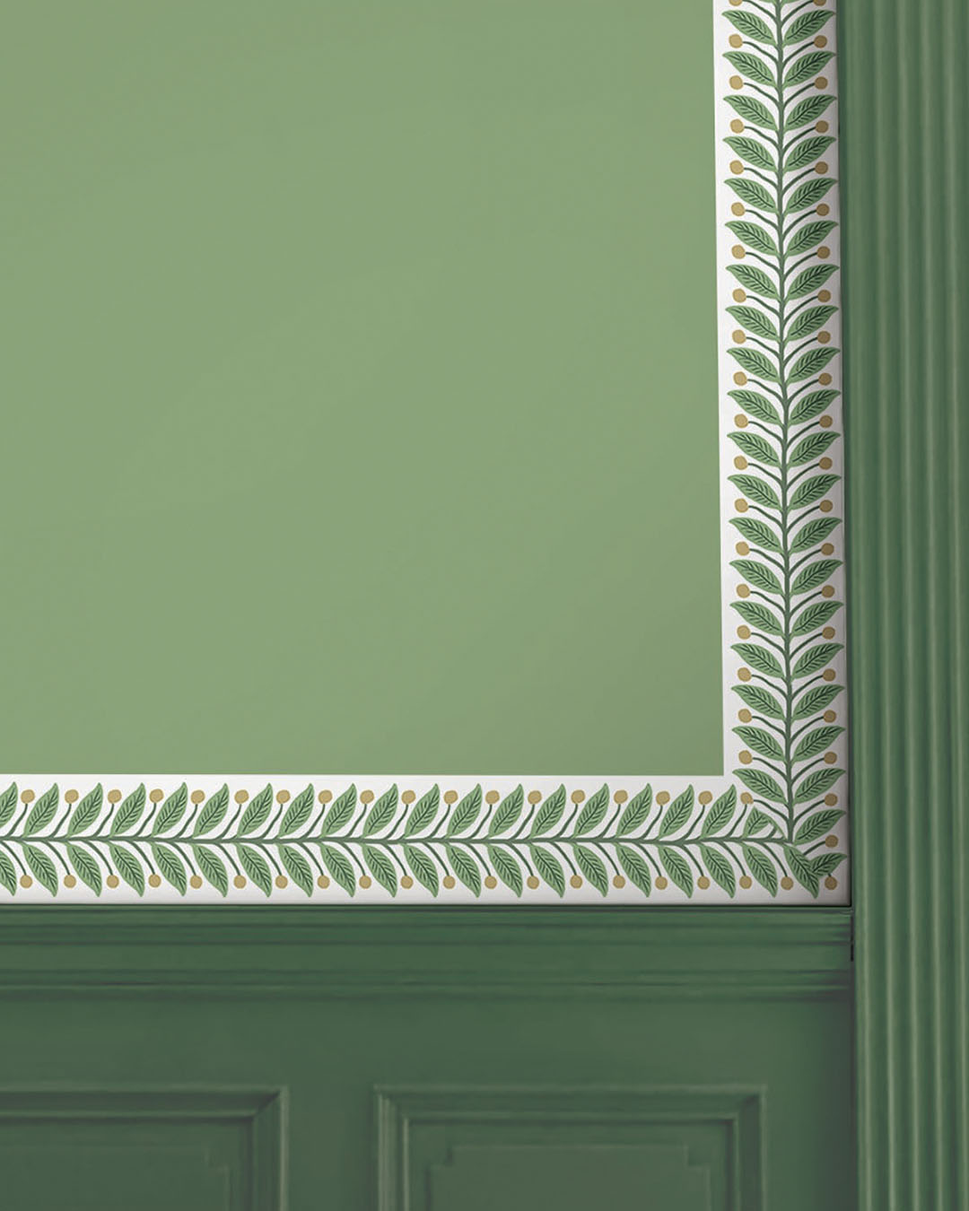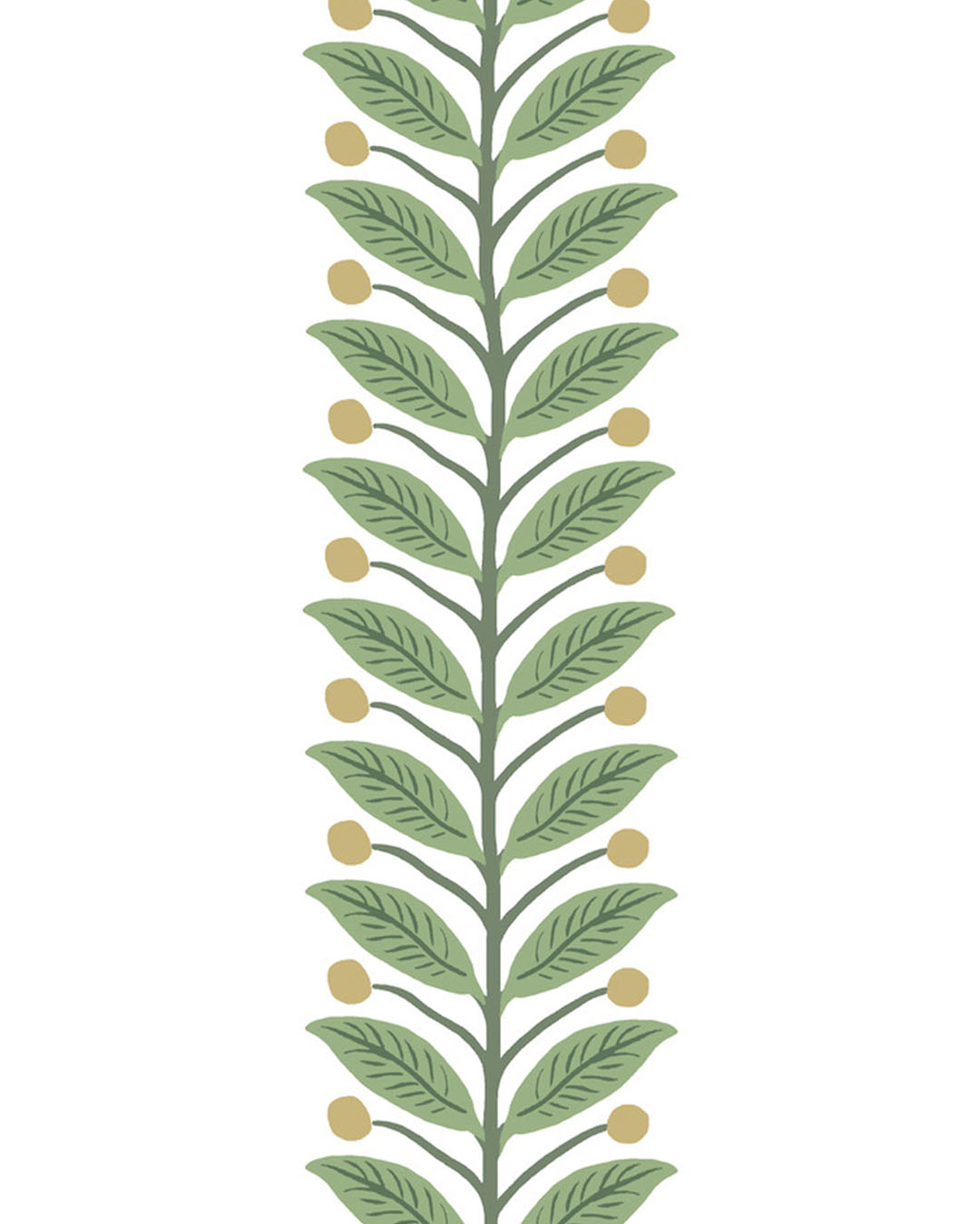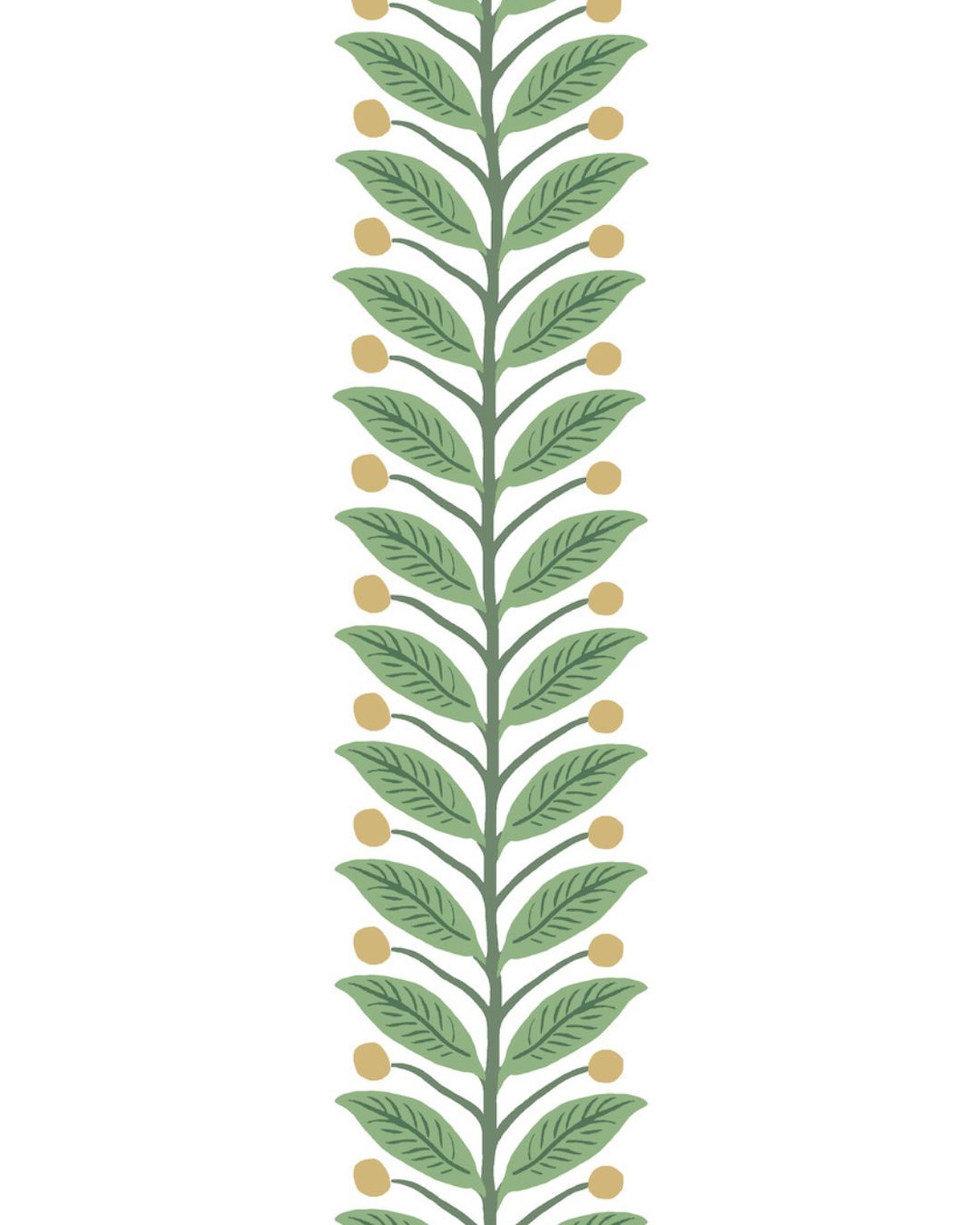 Garden Trim är en dekorativ bård med en stiliserad, handritad ranka som löper vackert längs rummet. Rankan består av parvisa blad och små runda bär. Botten är vit och bladen går i friska gröna nyanser med mörkare grön ådring och stjälken. Bären är i guldemtallic. En enkel, lättplacerad bård som ramar in dörrar, fönster eller väggfält och ger rummet mjuk grönska utan att ta över.
