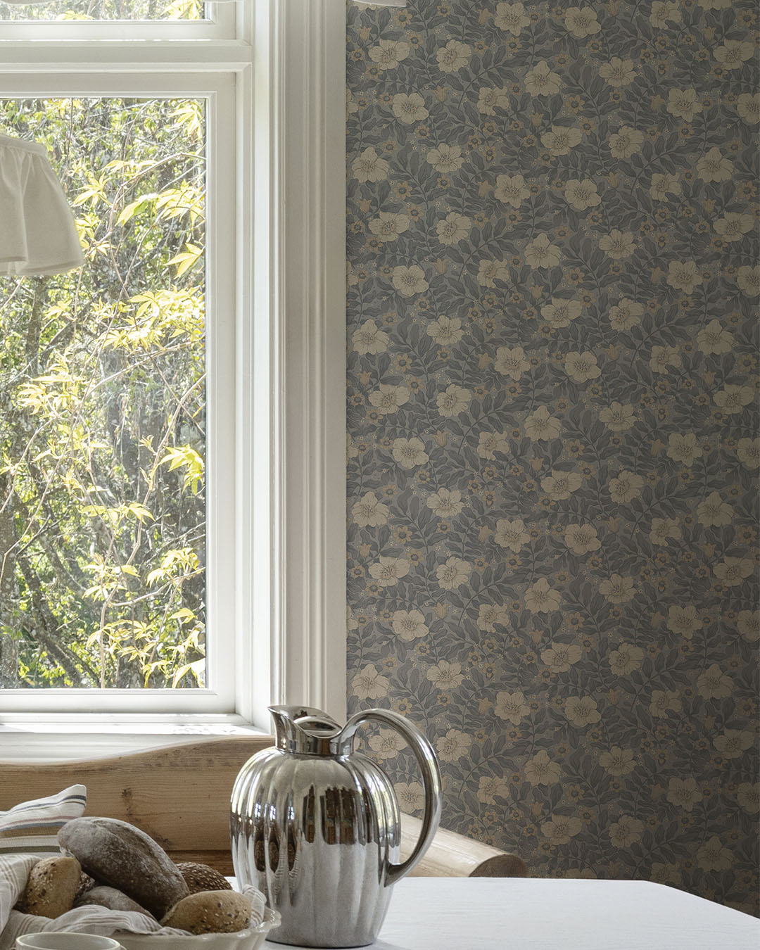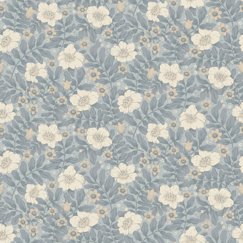 Tapeten Maggan med ljusblå botten och blommor och blad i vitt blått och beige ger rummet en uppfriskande och sval känsla. Ett hav av sommarblommor som böljande vajar i vinden skapar ett angenämt blickfång på väggarna. Här står sommaren i blom året om och pryder vänligt ditt hem.