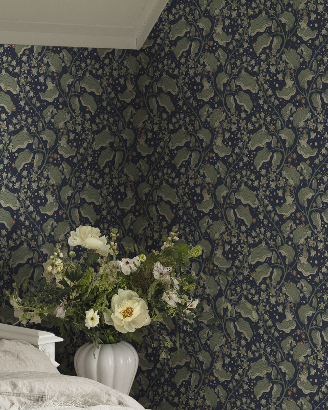 Tänk dig en stilla kväll tidigt på sommaren, du är utomhus, det börjar skymma och du passerar en blommande häck av syrén, du fylls av blommornas ljuvliga doft och du kan inte låta bli att stanna upp. För det är just i det här ögonblicket som syrénen doftar som mest. Det är just i det här ögonblicket allt det ljusa och vackra som sommaren för med sig ligger framför dig. Och det är just det här ögonblicket som tapeten Syrén fångar. På en mörkblå botten flätas syrénkvistarna samman där blad och blommor i nyanser av dov grönt, creme och terrakotta ger rummet en ljuvlig doft av sommar.