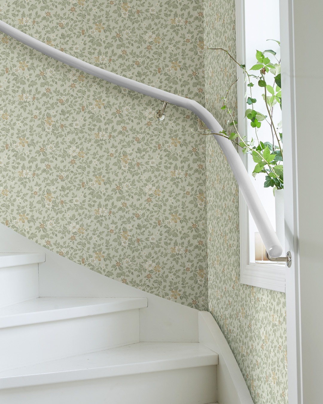 Omge dig med äppelträdets söta små blommor på kvist. Med tapeten Linnea i mjuk grågrön nyans täcker ett vackert blommande flor rummets väggar där äppelblom i vitt, beige och terrakotta skapar en rogivande och stillsam känsla. Tapetens mönster vittnar om att det är tid för mer värme och ljus såväl inne som ute.