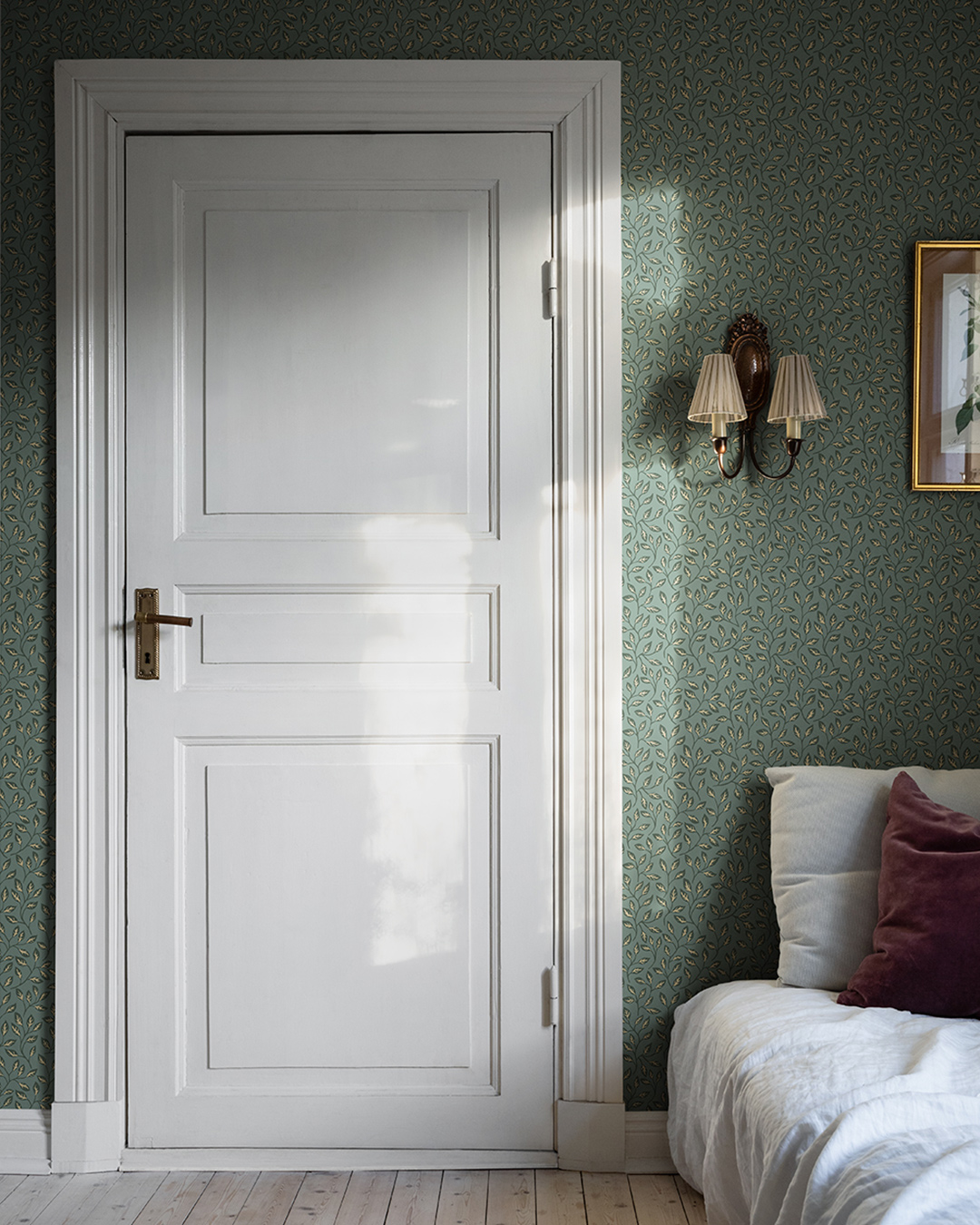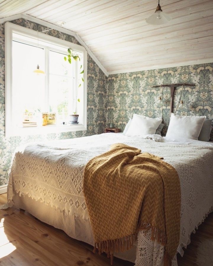 Inred sovrummet med lantliga tapeter
